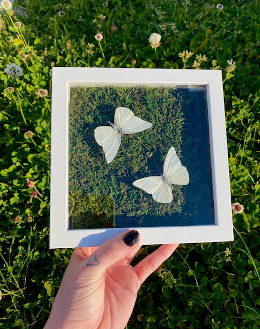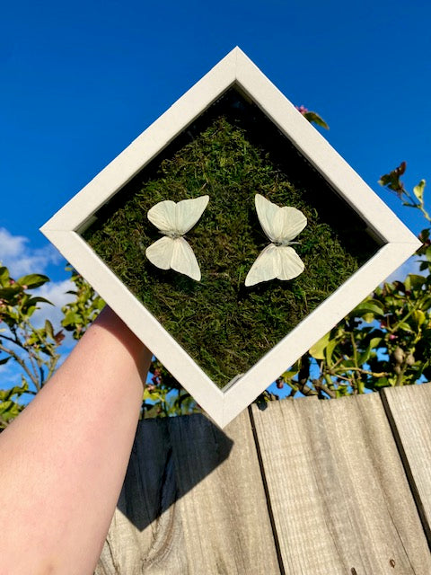 Two adorable white pearlescent butterflies placed on some dried moss