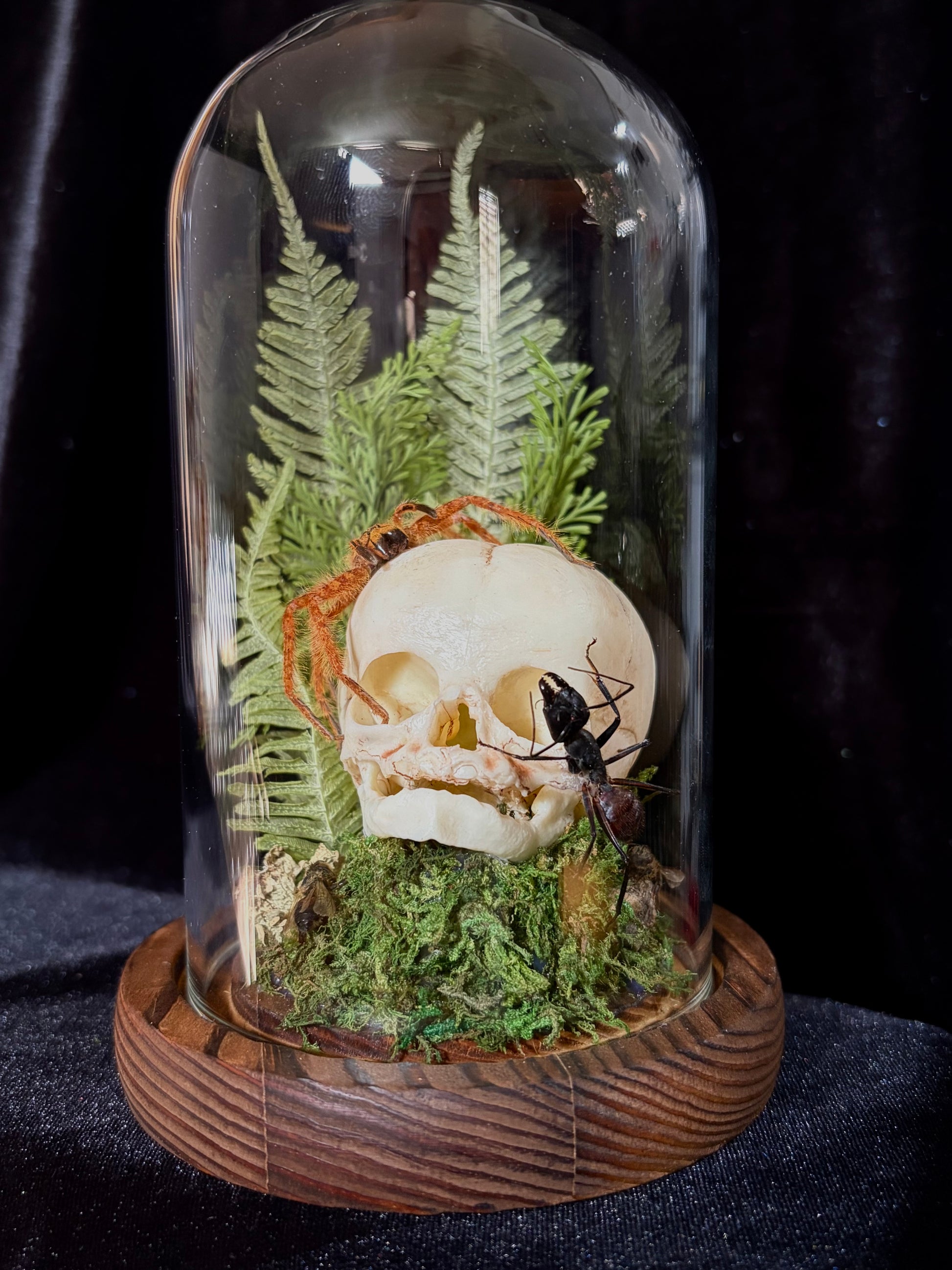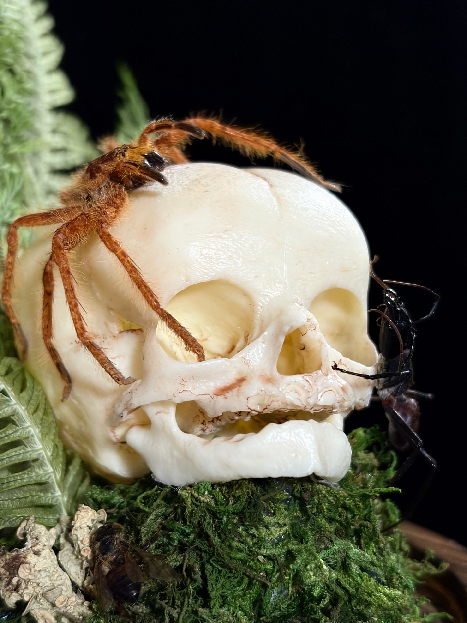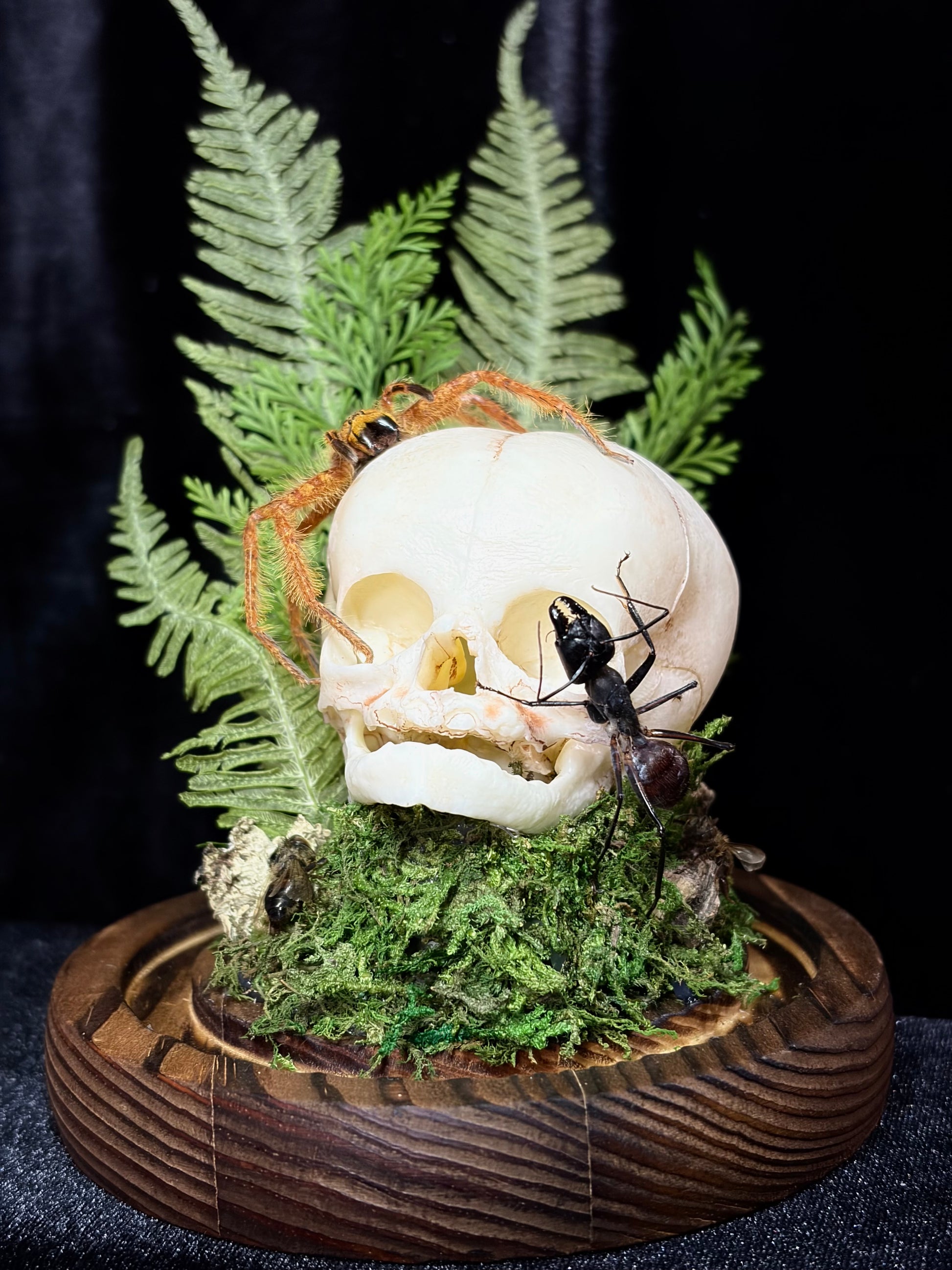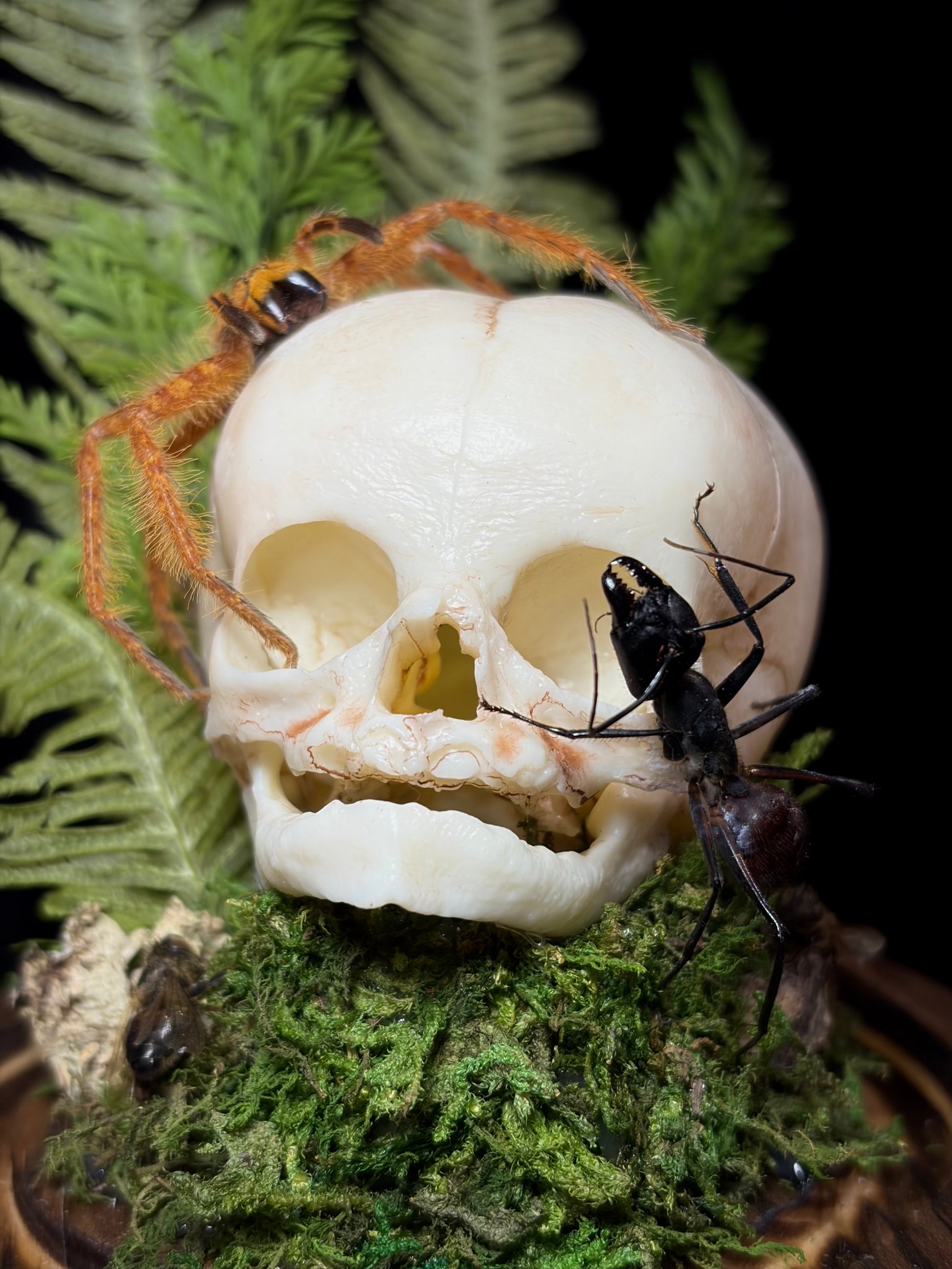 Forest floor dwellers that have found an unusual home inside of an abandoned foetus skull.