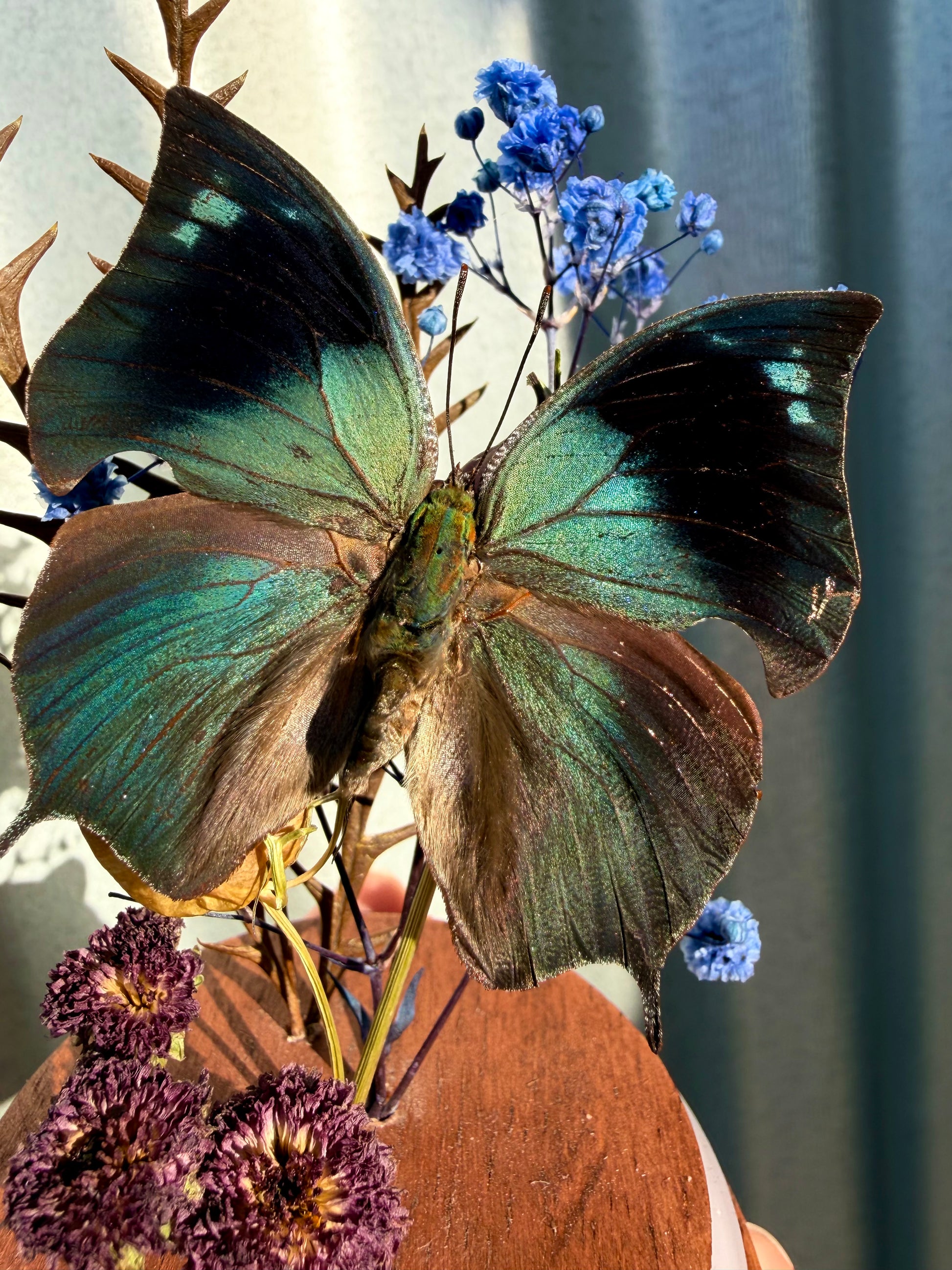 Colour: Topside is a dark blue with pale blue wings with a slight green to it. The underside is a mixture of browns to mimic leaf, this is great for camouflage.