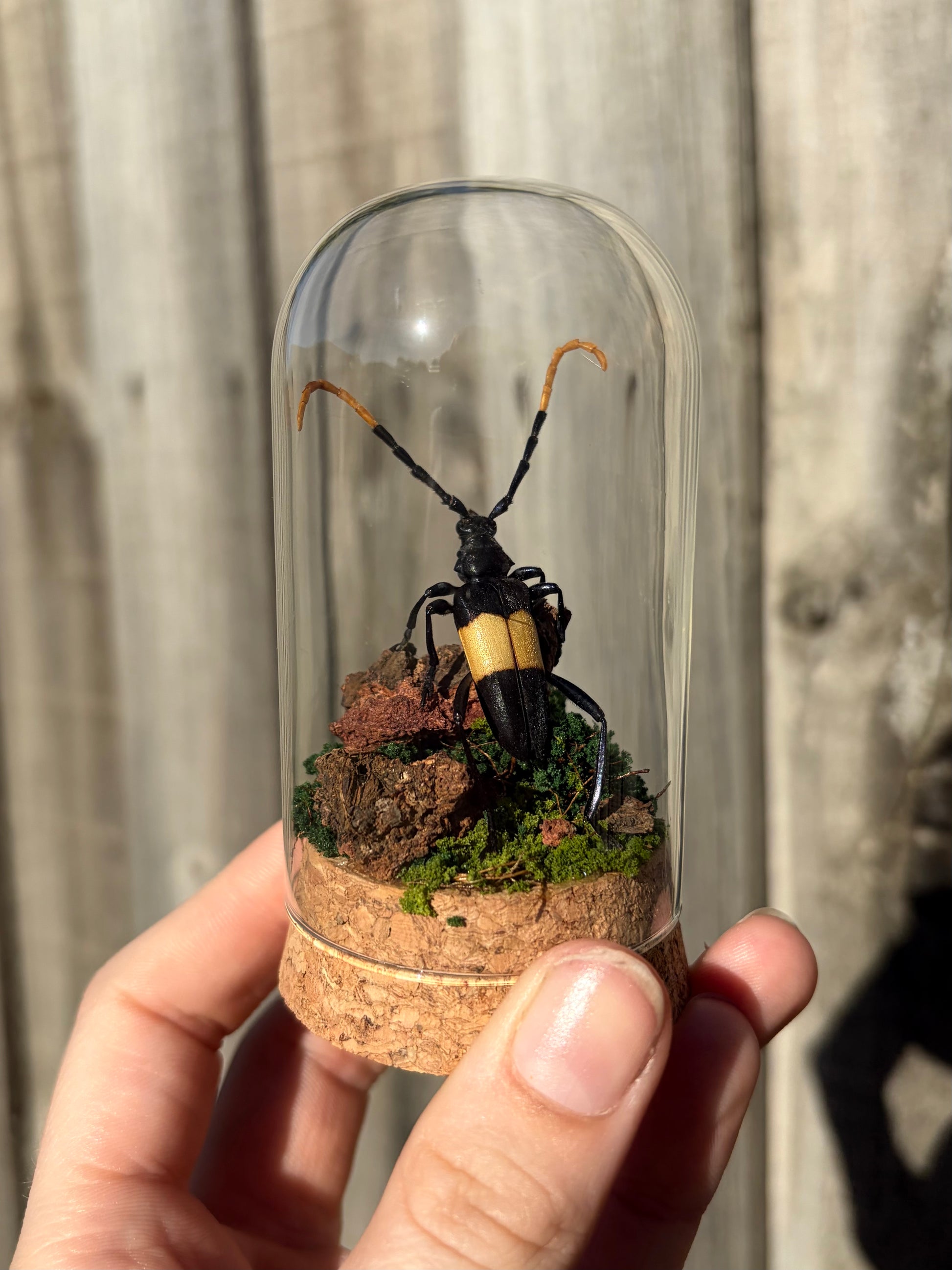 A preserved Pachyteria dimidiata displayed beneath a clear glass dome, set on a natural cork base. Featuring bold black and golden wing markings and long curved antennae, this striking longhorn beetle is arranged on textured bark and moss for a miniature woodland display.