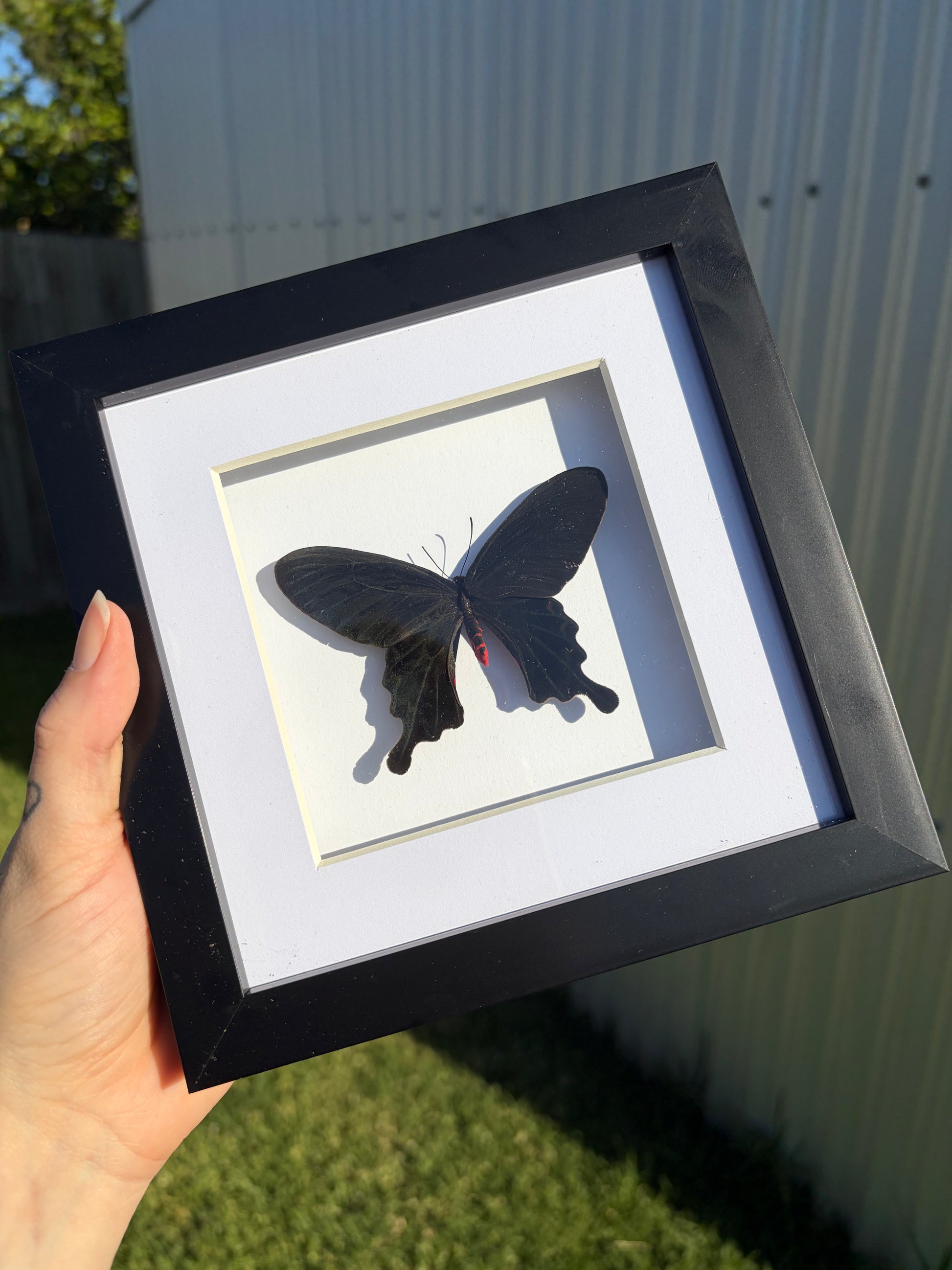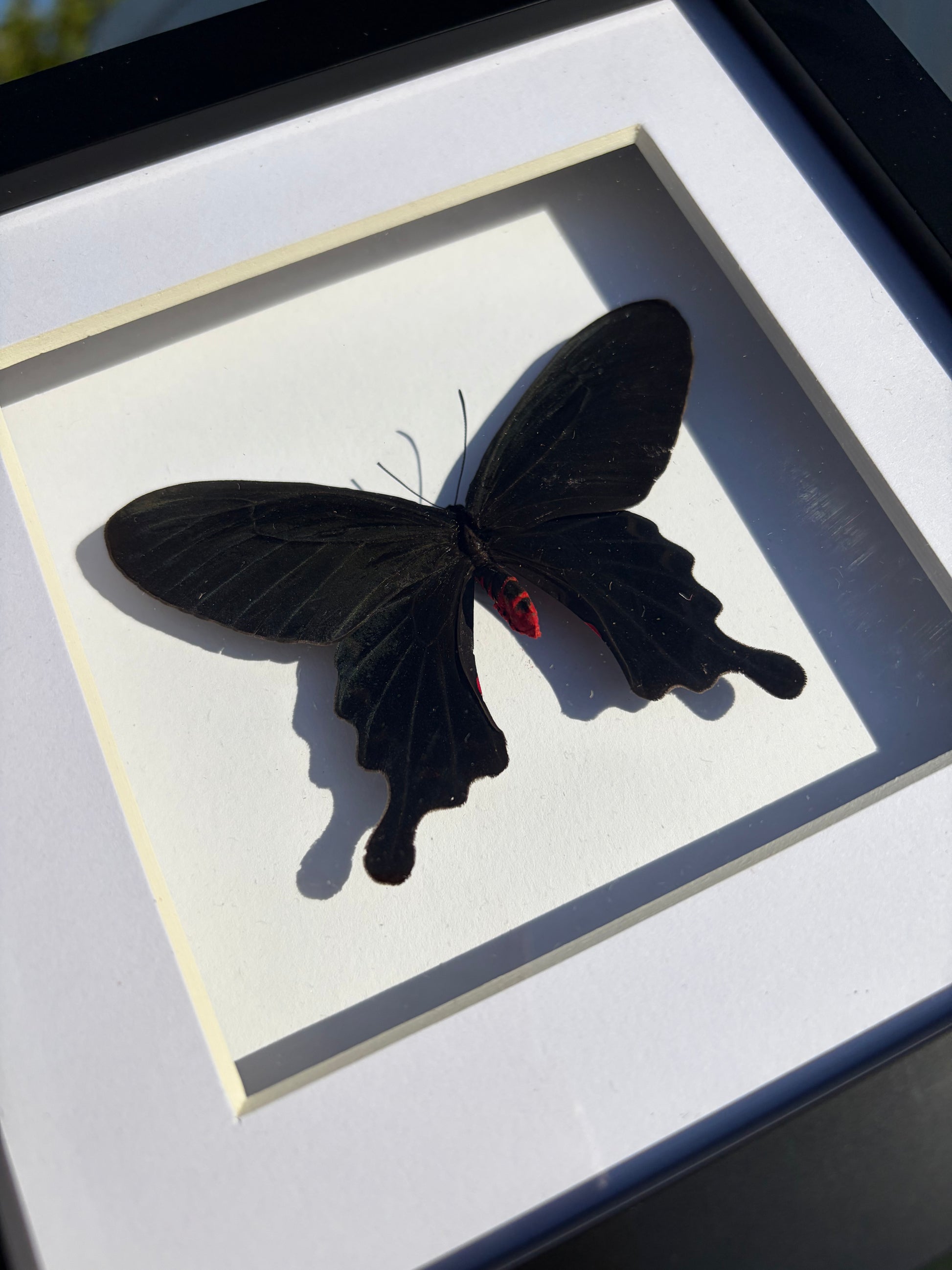 This is a framed specimen of the Pink Rose Swallowtail butterfly, also known as Pachliopta kotzebuea.