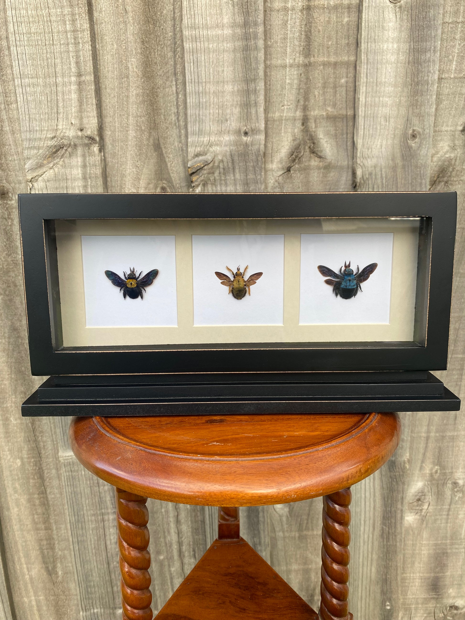 This is a unique standing frame that would be perfect for any shelf, you have the following displayed; a gold carpenter bee, blue & yellow