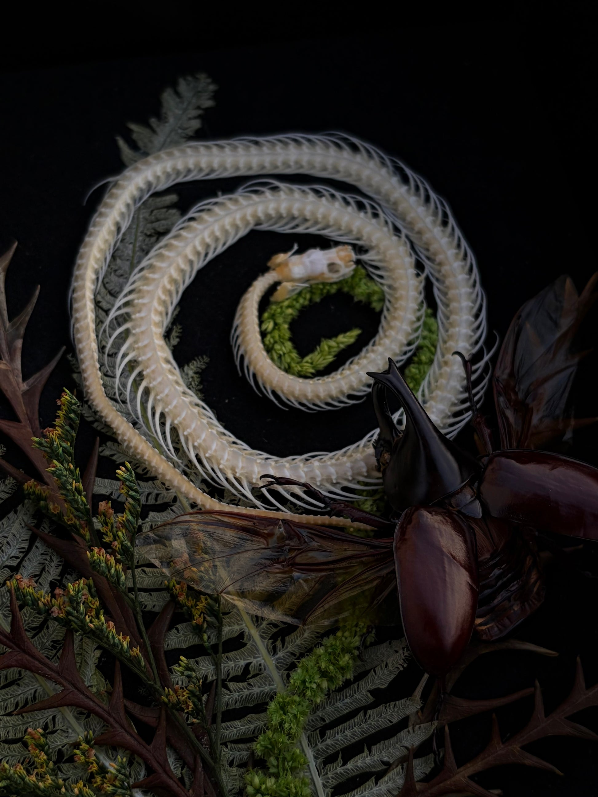 With its little hands resting on the snake, wings wide open is a male rhinoceros beetle from Japan.