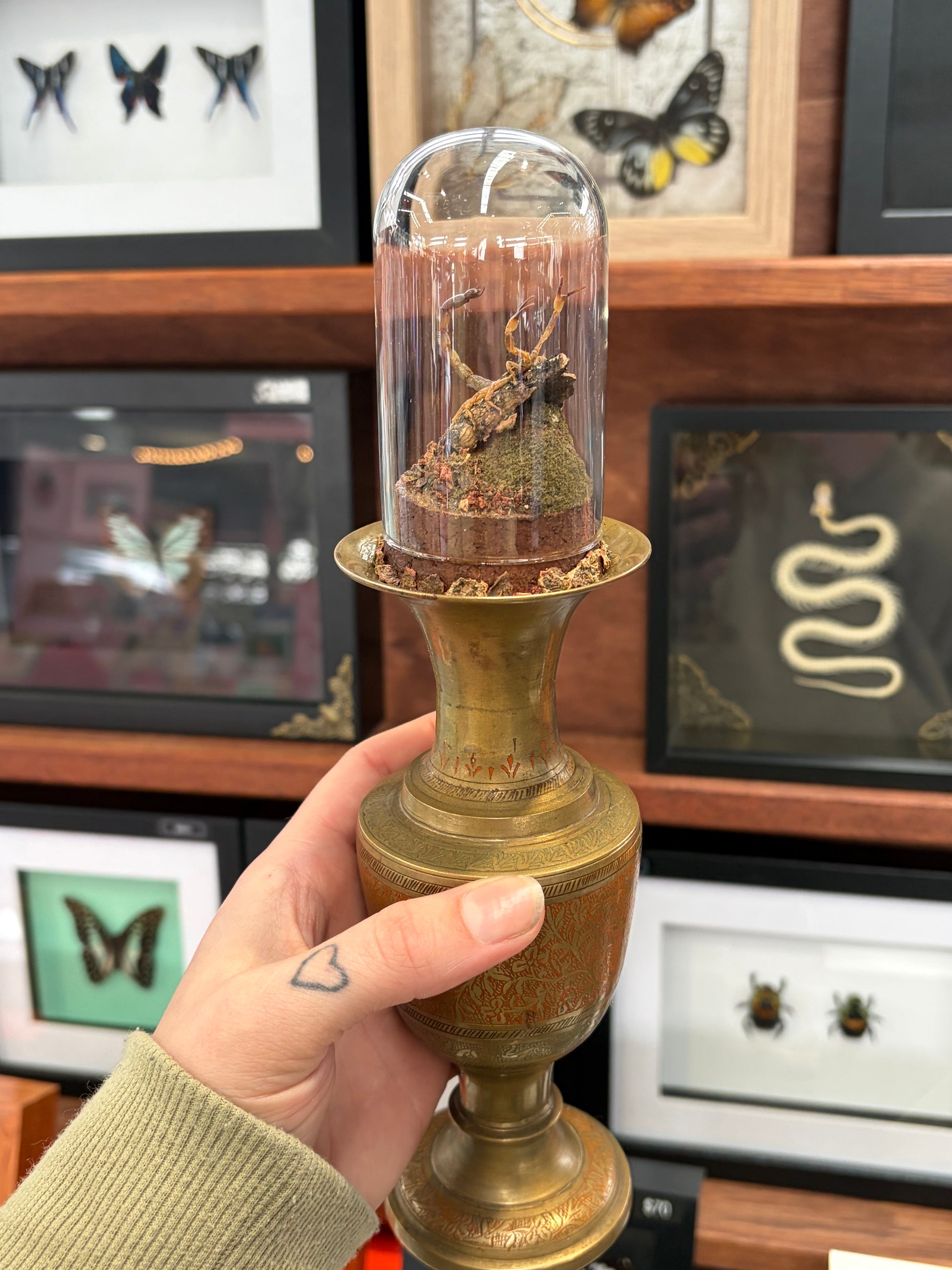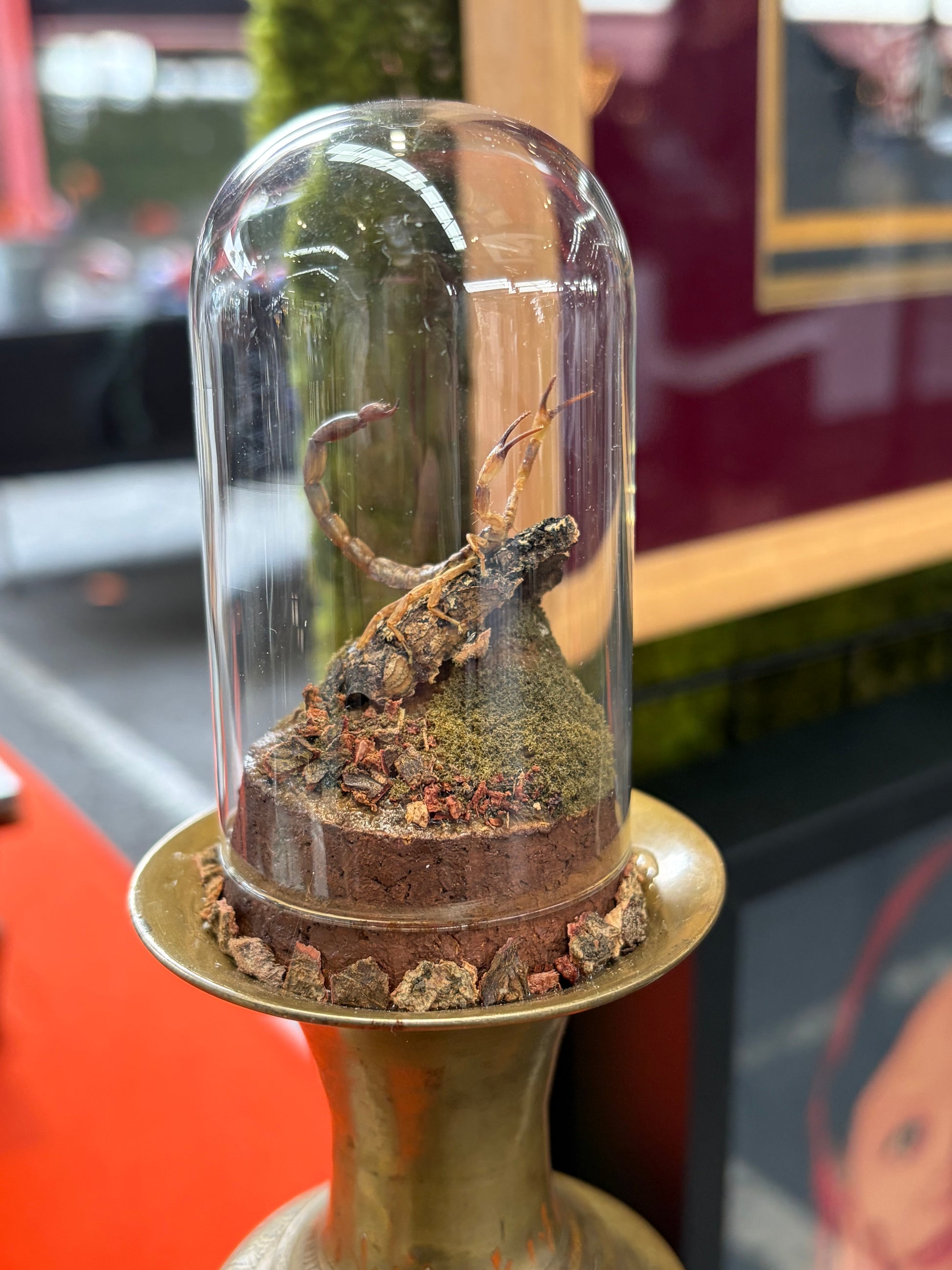 Yellow Java scorpion displayed on a vintage candle holder (not an urn, as much as it looks like one!)